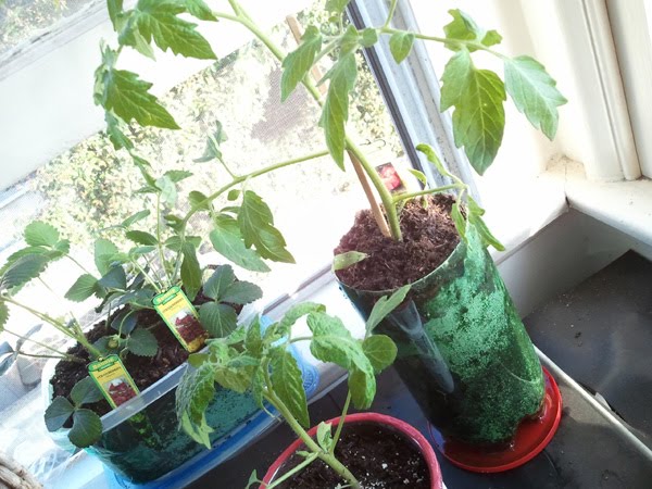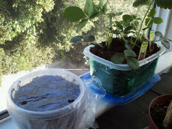 First up, strawberry and tomato seedlings. All the plastic lids and containers I didn't throw into the recycling bin have finally come in handy!