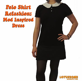 I was cleaning out my closet the other day when I came across some black polo shirts I had used for work before they issued us uniform shirts. My first thought was to donate them and then my second thought was "wait, I can make something out of these". Voila! What came about was a mod inspired dress. In a nutshell, the shirt was too short to wear as a dress so I added some dark gray jersey knit fabric to add some length, took in the shirt and sleeve some so it hugged my body more and added in a peter pan collar. It was a fairly easy revamp.