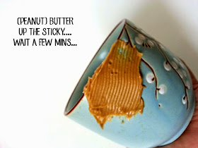 I bought a cherry blossom mug from Chinatown today and was annoyed the label didn't come off entirely so I took to the 'net to find a solution. I saw this post from Milehimama about using peanut butter. I tried her easy and quick method and it worked. No scrubbing, peeling, or scratching involved. Just spread the PB over the residue, wait a few mins and then gently scrape off with a plastic bread tie.